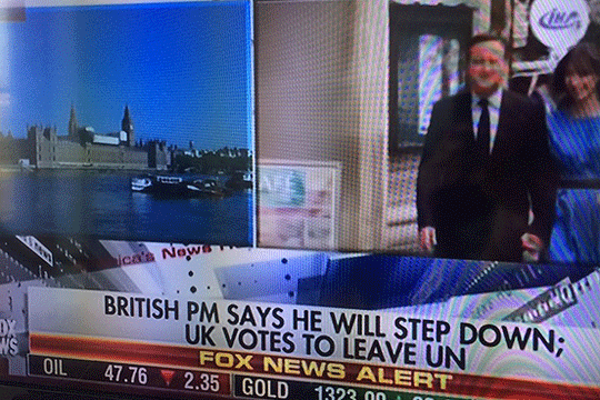 Фокс во текот на вклучувањето во живо од Лондон каде британскиот премиер Дејвид Камерон најави оставка, постави кајрон со натпис „британскиот премиер објави дека ја напушта функцијата, Обединето Кралство гласаше за излегување од Обединетите нации