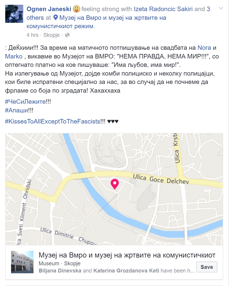 Во Музејот на македонска борба за слобода Нора Шаќири и нејзиното момче Марко Кума Марковиќ, со кого е долго во врска, склучија граѓански брак, кој го зачинија со многу политика и симболи од Шарената револуција.