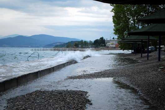Надојденото езеро кое изминатиот месец делумно ги проголта плажите долж охридската ривиеара, се уште не е повлечено, објави Охридњуз.