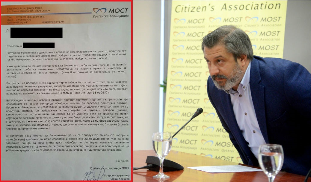 Уште едно предупредувачко писмо од невладината организација „Мост“ испратено лично до вработен во администрацијата. Во писмото потпишано од Дарко Алексов, „Мост“ ја предупредува вработената во администрацијата дека „како вработена во јавниот сектор треба да бидете во служба на сите граѓани и со вашите активности треба да овозможите остварување на нивните права и интереси, со истовремена грижа за јавниот интерес (член 8 од Законот за вработените во јавниот сектор)“.