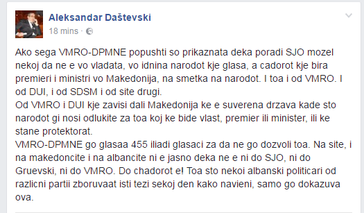 ВМРО-ДПМНЕ го гласаа 455 илјади гласачи за да не го дозволи тоа. На сите, и на Македонците и на Албанците ни е јасно дека не е ни до СЈО, ни до Груевски, ни до ВМРО. До чадорот е! Тоа што некои албански политичари од различни партии зборуваат исти тези секој ден како навиени, само го докажува ова“, објави Даштевски на „Фејсбук“.