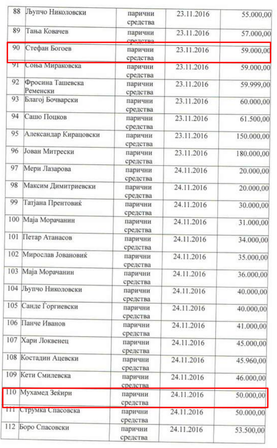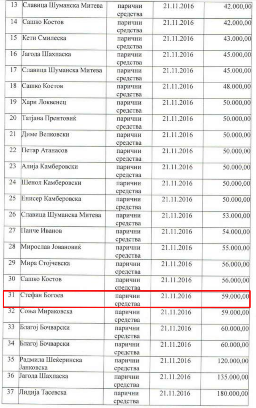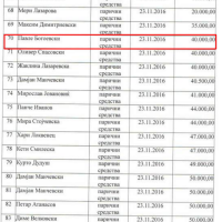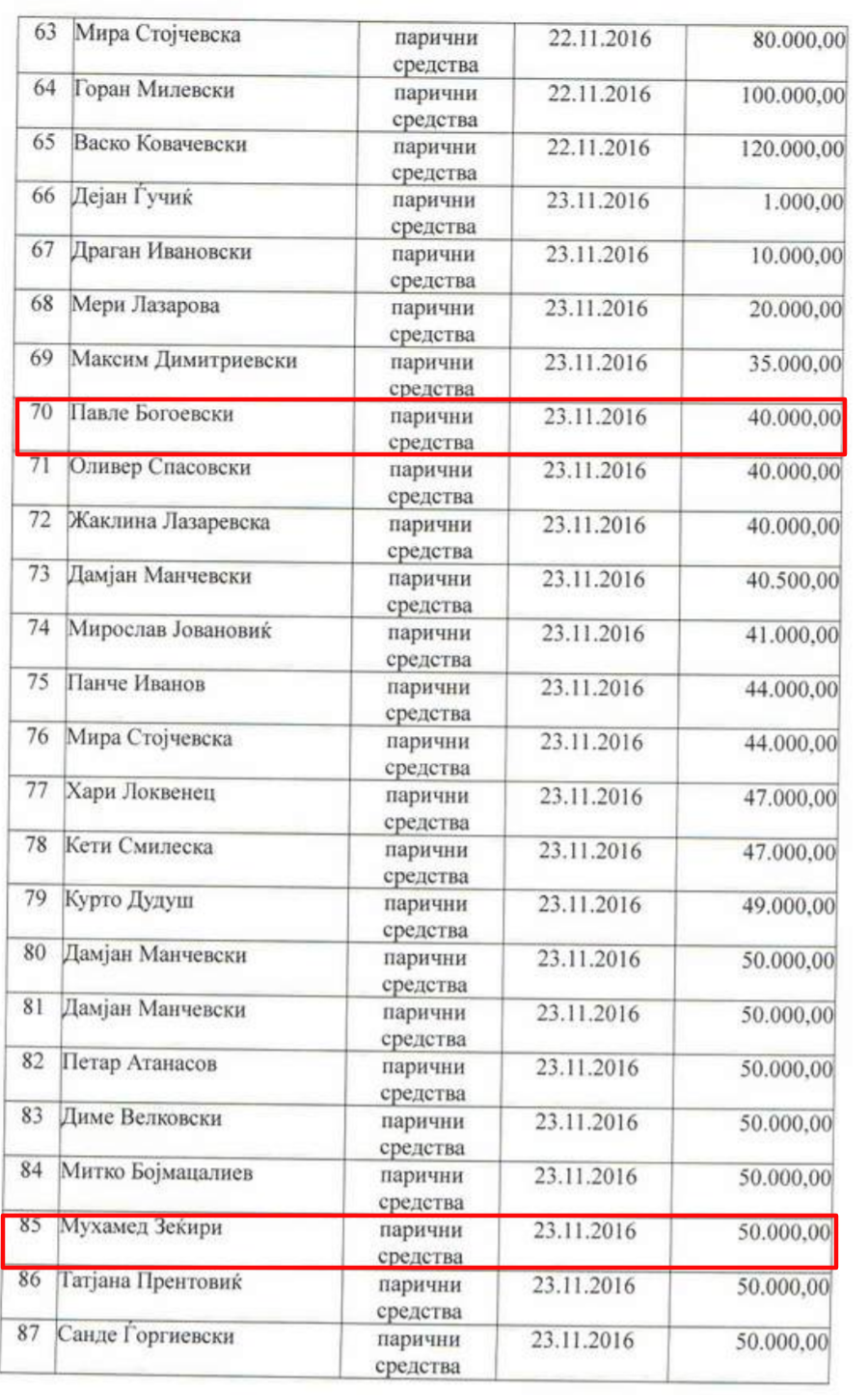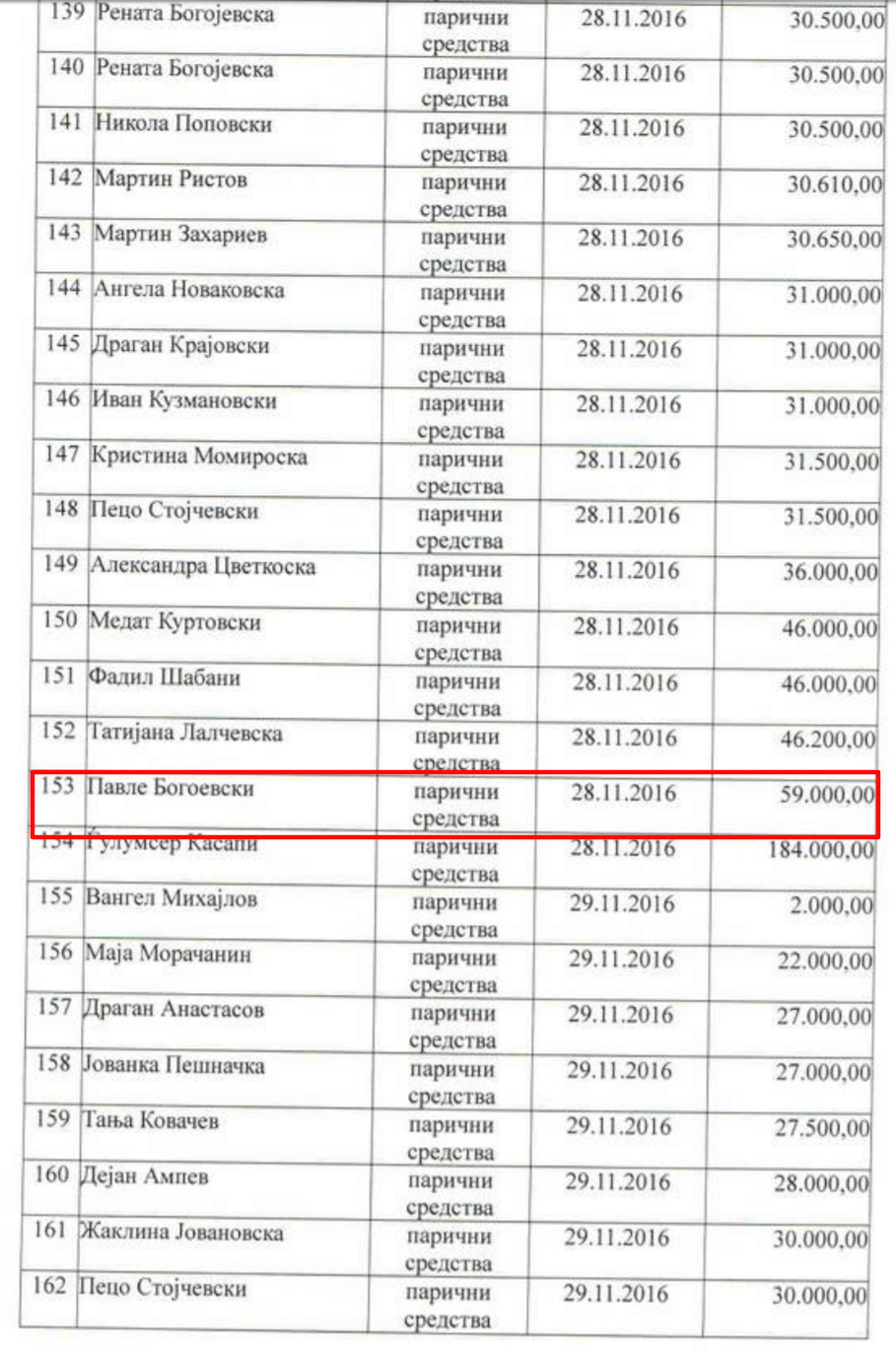 Нејзиниот партнер во насилствата на платеничката револуција Павле Богоевски на сметка на СДСМ на 23 ноември донира 40.000 денари, а пет дена подоцна на 28 ноември донира уште 59.000 денари.