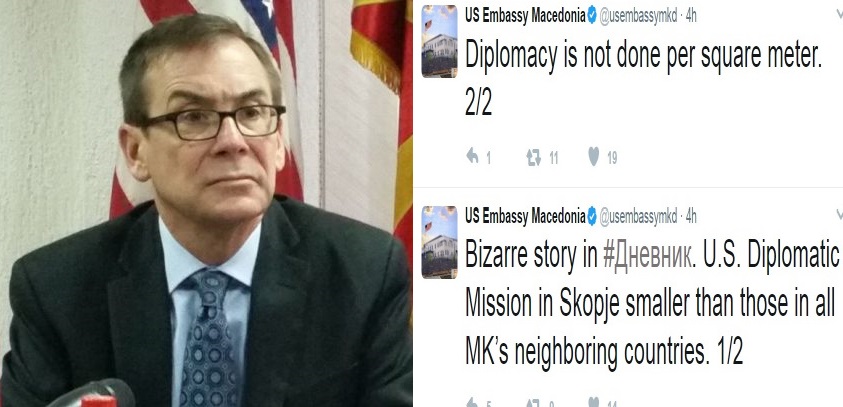 Освен ова, во вториот твит е наведено „дипломатија не се прави на квадратен метар“, а што, сигурно, се однесува на суштината на вчера објавениот текст во „Дневник“, чијшто наслов и главна поента беше дека „САД во Скопје имаат трипати повеќе дипломати отколку во Софија и двапати повеќе отколку во Тирана“.