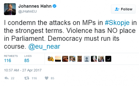 Еврокомесарот за проширување и добрососедска политика, Јоханес Хан, на својот твитер-профил ги осуди насилствата и нападот на пратенциите во Собранието а Република Македонија, порачувајќи дека демократијата треба да продолжи по својот курс.