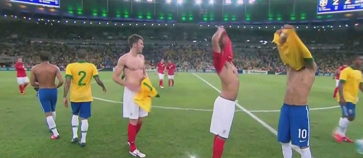 Репрезентативец на Англија и фудбалер од Премиер-лигата не смее да моли противнички играч за дрес, па макар тоа бил и Нејмар, се коментарите на британските медиуми, по потегот што го направи Оксладе Чембрлен во дуелот со Бразил синоќа. Камерите го фатија фудбалерот на Арсенал, на 20 минути до крајот на мечот, како го „моли“ Нејмар да ги сменат дресовите по натпреварот.