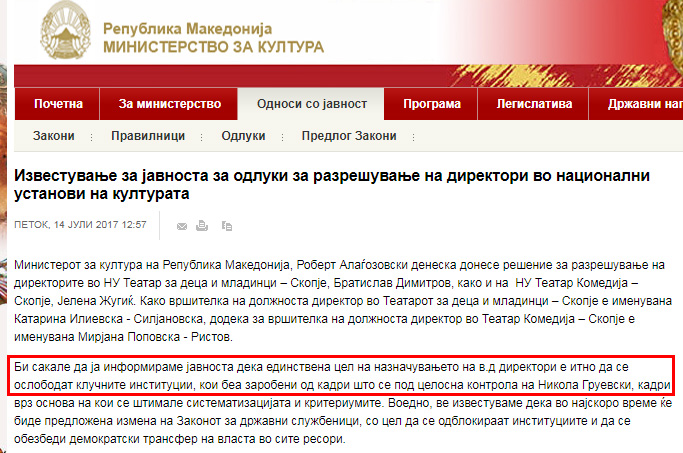 Скандалозна одлука која нема никаква врска со мирен трансфер на власта и демократските промени и стандарди – токму вака е коментирана скандалозната промена на директорите на Театарот Комедија и Театарот за деца и младинци. Оваа одлука од Министерството за култура ја објаснија со невидена фашизоидна и тоталитарна реторика – дека единствена цел за смената на Јелена Жугиќ и Бато Димитров била „да се ослободат институциите од кадри кои биле под целосна контрола на Никола Груевски“.