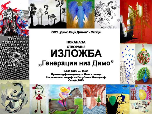 Во Мултимедијалниот центар – „Мала станица“ утре, во 19 часот, ќе биде отворена изложба насловена како ,,Генерации низ Димо“, на која ќе бидат презентирани творби од 15-тина талентирни млади луѓе кои својот талент го покажале во училишните денови поминати во основното училиште „Димо Хаџи Димов“. Ова е единствениот начин со кој може да се презентира и негува ликовниот талент кај учениците. Воедно се потврдува дека желбата и талентот за ликовно изразување нема граници. Соработката може да се одржува и покрај изминатите години. На изложбата ќе се презентираат талентираните ученици од „Димо Хаџи Димов“ во соработка и менторство на ликовниот педагог Соња Поповска-Трајковска. Успевајќи да го препознае талентот кај учениците во четирите години дружење и успешно да одржи континуитет во нивното ликовно изразување, со оваа изложба само ја потврдува нивната вистина. Оваа изложба не е тематска бидејќи секој од учесниците е премногу индивидуалист и со различна имагинација. Делата можете да ги доживеете колористички, графички и колажно и така да уживате во нивната различност, а сепак кажани со ист јазик УМЕТНОСТА.