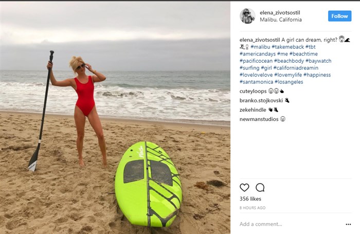 Имено Елена објави фотка во стилот на Памела Андерсон од познатиот филм Чувари на плажата. Во Малибу и покрај плажа, Елена дефинитивно потсетува на Памела Андерсон..