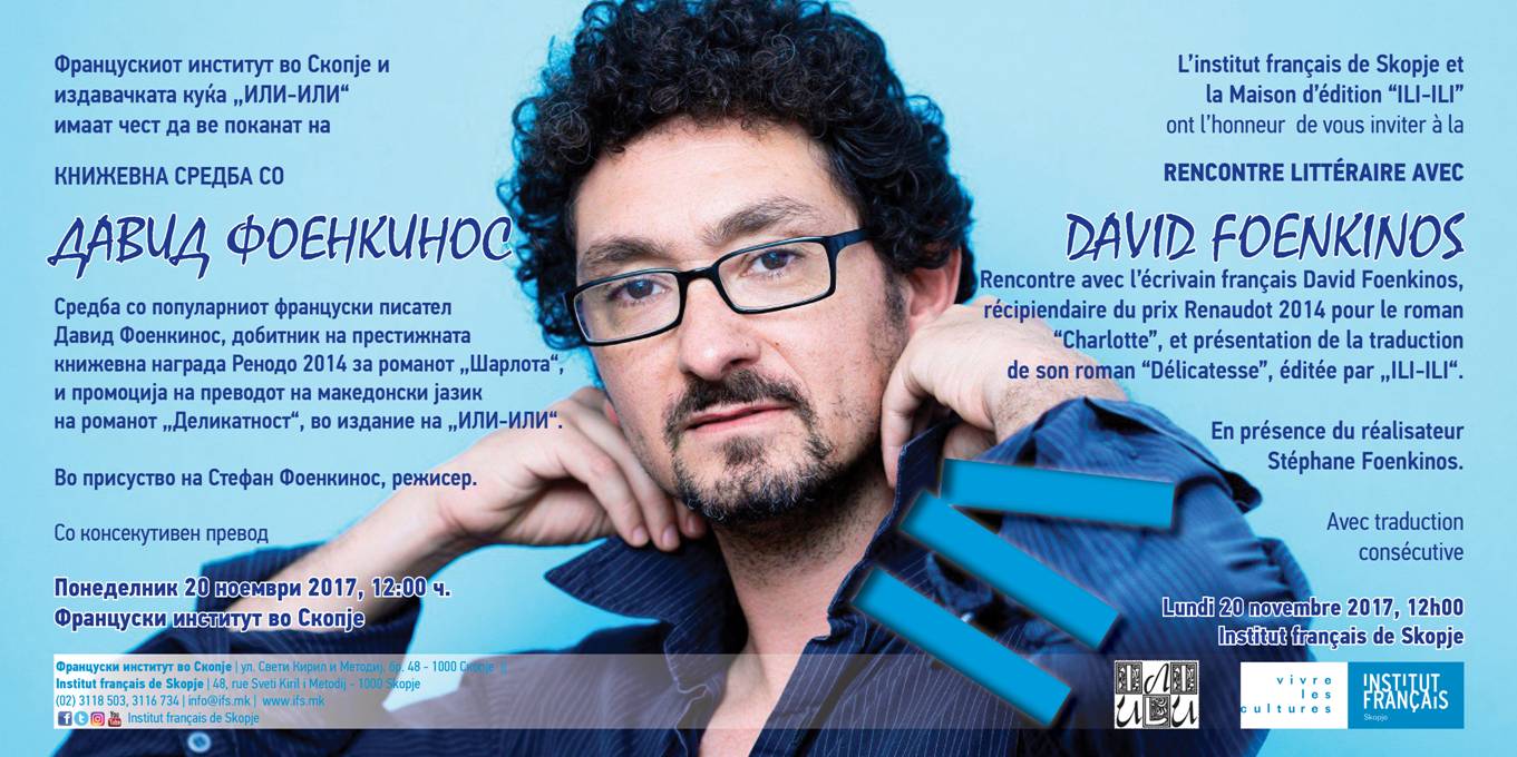 Францускиот институт во Скопје и издавачката куќа ИЛИ-ИЛИ организираат книжевна средба со популарниот француски писател Давид Фоенконос по повод објавувањето на неговиот роман „Деликатност“ во превод од француски на Катица Гароска Ацевска (Или-Или, 2017). Средбата ќе се одржи во понеделник, 20 ноември, во 12 часот во Францускиот институт во Скопје.