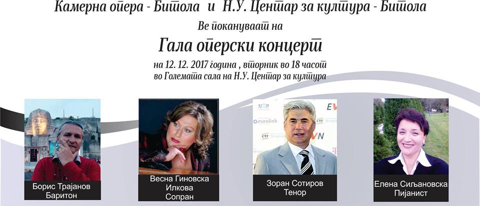 Камерна опера ” Кирил Македонски” – Битола и Н.У. Центар за култура – Битола,организираат Гала оперски концерт денеска (12.12.2017) во 18 часот (Голема сала).