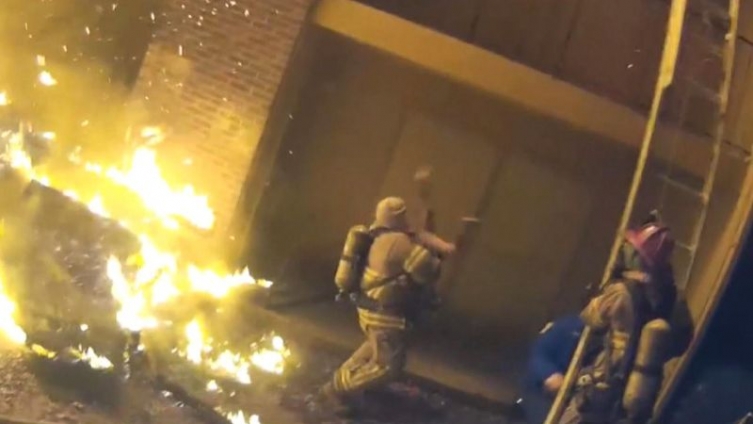 Пожарникар фати дете фрлено од трети кат од зграда во пламен (видео)