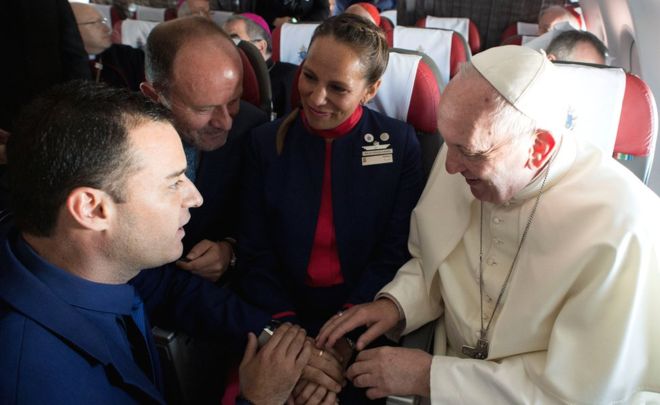 Папата Франциск предложи да изведе кратка церемонија за време на краткиот лет од Сантијаго до градот Икике во северниот дел на Чиле. За сведок на церемонијата беше земен шефот на авиолинијата.