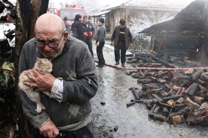 Фотографијата од еден 83-годишник кој го држи мачето во рацете, а зад грбот има оган по пожарот во кој го изгубил својот дом, предизвика бура на емоции на социјалните мрежи.