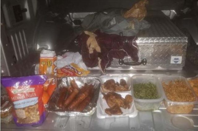 Хенсен со себе носел спортска торба во која ставил три шишиња виски и вињаци, а тука има се и сешто-овошје, грицки, цигари, но и скара, печено пиле па дури и колбаси. Станува збор за човек осуден на 27 месеци поради злоупотреба на дрога, на кого сега му се заканува дополнителна казна.