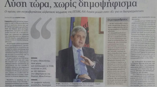 Под наслов „Решение сега, без референдум“, неделното издание на грчкиот весник „Катимерини“ ги пренесува ставовите на претседателот на ДУИ, Али Ахметиво врска со преговорите за името меѓу двете земји.