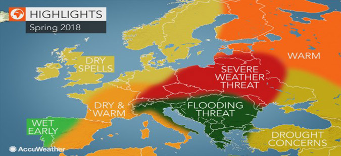 Американската метеоролошка служба „Акјуведер“ (AccuWeather) објави временска прогноза за пролет 2018 во Европа, во која предупредува на висок ризик од поплави на Балканот поради чести врнежи дожд.