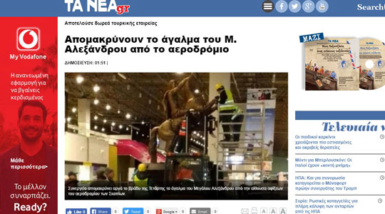 „Отстранет споменикот на Александар Велики од аеродромот во Скопје“ е насловот на веста на АНА-МПА.
