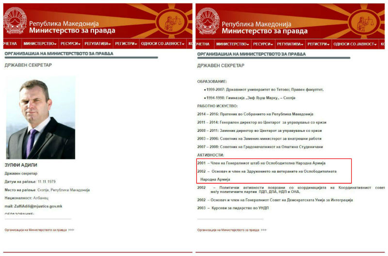 Во официјалната биографија на државниот секретар на Министерството на правда Зулфи Адили, кој е поранешен пратеник на ДУИ, а потоа и на Унитети, меѓу другото стои податокот дека бил член на генералниот штаб на паравоената ОНА, која го иницираше конфликтот во земјава во 2001 година, пишува „Независен весник“.