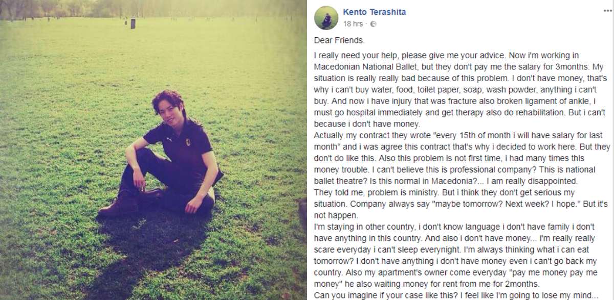 Веќе три месеци јапонскиот танчар Кенто Тирашита, кој од 2016 година е ангажиран како надворешен соработник во Македонската опера и балет (МОБ), нема добиено хонорар за својата работа и очаен побара помош на социјалните мрежи.