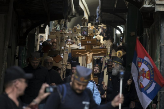 Група верници, на Велигден, пееја во Ерусалим “Од Косово зората се буди..”. Меѓу нив имаше и посетители од Грција, Русија и Бугарија …
