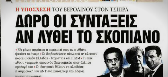 – Веродостојни европски извори, пренесувајќи ги за „Та неа“ разговорите што во позадина се водат меѓу Атина и Берлин, ги претставуваат Германците дека му ветиле на Алексис Ципрас размена со силна политичка корист за него и за СИРИЗА, во случај да постигне договор за името на Скопје со неговиот колега Зоран Заев. Станува збор за префрлање за шест месеци подоцна на мерката за кратење на пензиите, пишува весникот и додава дека со тоа владата би можела да земе даде длабок здив и ќе му го отвори патот на Ципрас кон распишување избори во мај 2019.