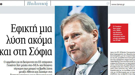 Еврокомесарот за проширување Јоханес Хан, во интервју за грчкиот весник „Та неа“, изрази убеденост дека може да се постигне решение за името, и оценува дека во Софија нема да биде одлучувачката точка за тоа дали ќе има решение, туку тоа што е важно во овој процес е квалитетот на договорот.