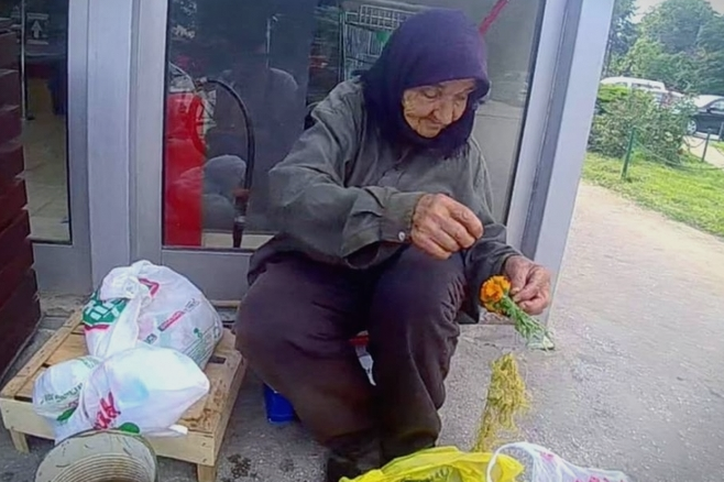 Оваа бабичка продава цвеќиња пред Тинекс маркетот во Карпош 3 и покрај тешката судбината таа вели де цвеќињата ја радуваат. Во статусот кој е објавен на Фејсбук од лицето Горјан Јовановски пишува дека таа останала без ќерката која починала пред 2 години и двете внучиња останале на неа.