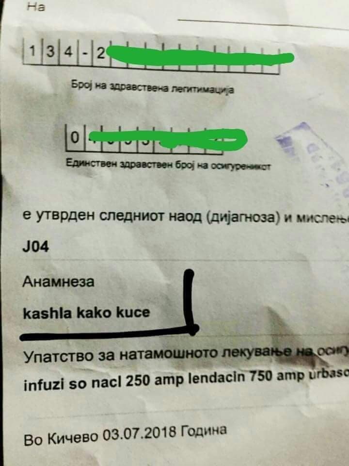 На социјалните мрежи, мајка од Кичево постираше дијагноза од лекар во која во анамнезата е наведено „Кашла како куче“.