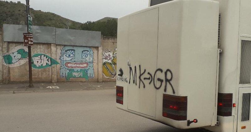 Автобус на компанијата „Атом“ од Кочани по еднонеделниот престој во Грција морал да се врати во Македонија без регистерски таблички на чие што место наместо меѓународниот код МК со спреј бил испишано дека македонскиот код е грчки, пишува СДК.