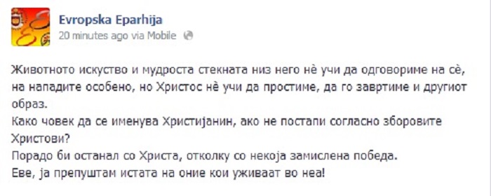Откако вчера во интервју за Нетпрес, премиерот Груевски го критикуваше Отецот Пимен, денес тој возврати со коментар на Фејсбук страната на Европската епархија на МПЦ.