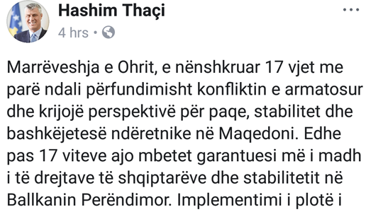 – Охридскиот договор, кој се потпиша пред 17 години, стави крај на вооружениот конфликт и создаде перспектива за мир, стабилност и меѓуетнички соживот во Македонија. И по 17 години тој останува најголема гаранција за правата на Албанците и стабилноста на Западен Балкан, напиша Тачи на Фејсбук по повод годишнината од потпишувањето на Охридскиот рамковен договор.