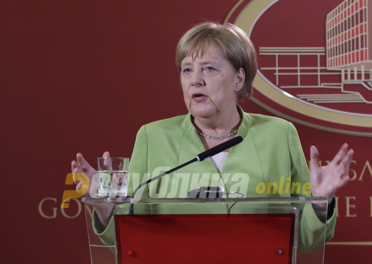 „Јас не сум за закани, ако има позитивен исход референдумот вие можете да станете членка на НАТО, а потоа и на ЕУ. Но, има предуслови. Имаше спор, мораше да се најде решение за тој спор. Затоа, прашањето на НАТО и решението на тој спор се многу тесно поврзани, бидејќи знаеме дека нема сите членки да гласаат за прием на вашата земја во НАТО, ако ова не биде решено. Луѓето на 30 септември имаат можност исто како што направија пред 27 години, да гласаат дали сакат да припаѓат на семејство на ЕУ и НАТО, а тоа бара истовремено прифаќање на Договорот со Грција“, одговори Меркел на прашање зошто Македонија да остане во изолација ако не успее референдумот.