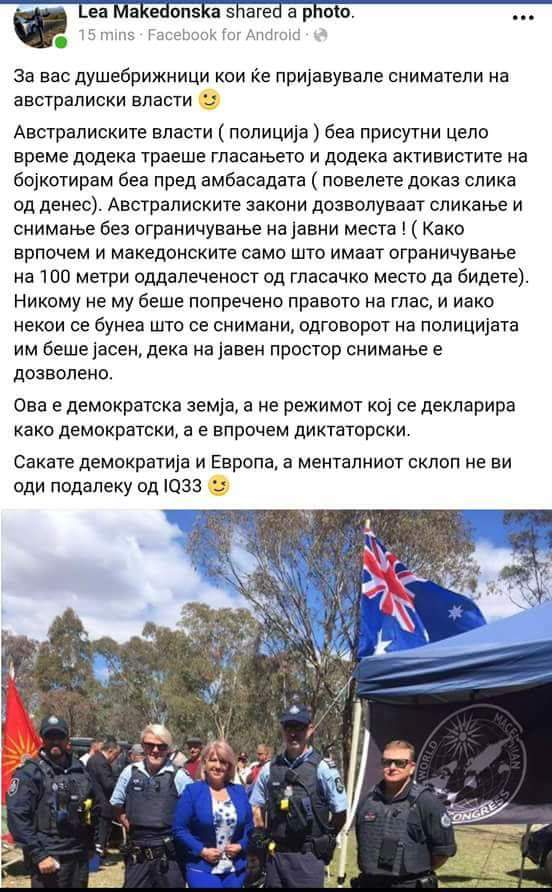 Вчера се крена бура од коментари, реакции и закани по наводното некоректно однесување на нашите иселеници кои им викаа „ПРЕДАВНИЦИ“ на тие што одеа да гласаат за промена на нашето уставно име. Адеми во стил на Елиот Нес најави дека „ја средил“ работата со Австралија и тамошните власти. Но, како што се чини нашите имаат поинаков став. Имено според нив полицијата била присутна цело време и немало никаков проблем, а Австралија како демократска земја не забранува снимање. Тие преку статуси на социјалните мрежи објаснуваат дека никому не било попречено правота на глас и дека според полицијата правато на снимање на јавен простор е дозволено..
