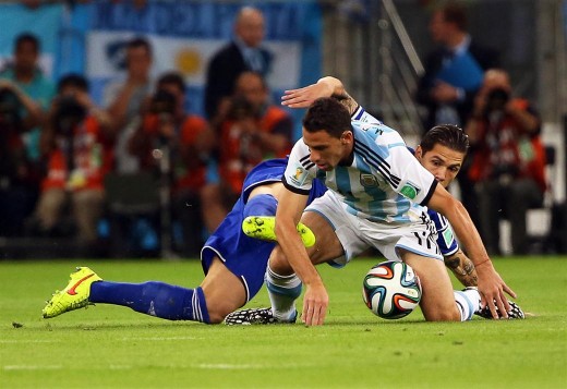 epa04259927 Bosnia’s Muhamed Besic (back) in action against Maxi Rodriguez (front) of Argentina during the FIFA World Cup 2014 group F preliminary round match between Argentina and Bosnia and Herzegovina at the Estadio do Maracana in Rio de Janeiro, Brazil, 15 June 2014.