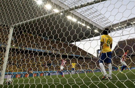 epa04252483 Brazil’s Marcelo (C) reacts after scoring the 0:1 by an own goal during the FIFA World Cup 2014 group A preliminary round match between Brazil and Croatia at the Arena Corinthians in Sao Paulo, Brazil, 12 June 2014.