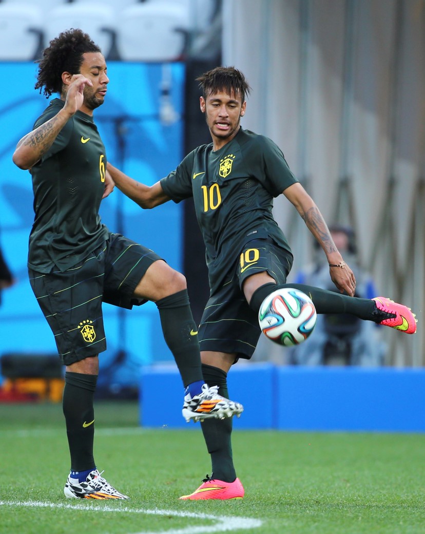 epa04250975 Brazilian soccer player Marcelo (L) and Neymar Jr during a training session at the Arena Corinthians stadium in Sao Paulo, Brazil, 11 June 2014. The FIFA World Cup will take place in Brazil from 12 June to 13 July 2014.