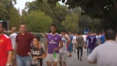 Фановите на Реал Мадрид од нивната фан зона се упатуваат кон Националната арена „Филип Втори“. Еуфорични се движат...
