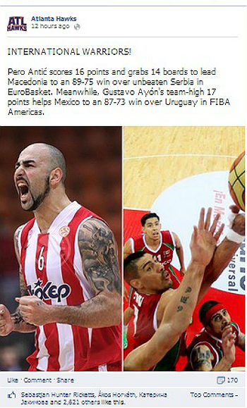 Атланта Хокс, новиот тим на Перо Антиќ, на својот ФБ профил повторно го пофали својот играч за дабл дабл учинокот...