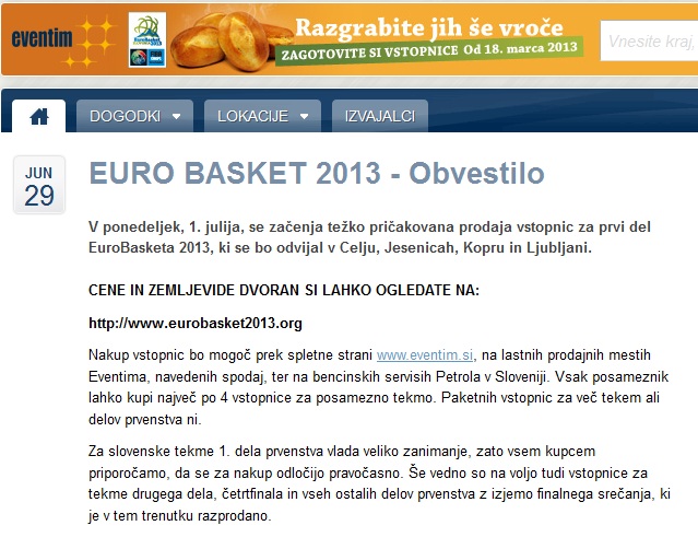 Од утре ќе се продаваат билетите за Европското првенство во кошарка во Словенија. Може да се купат преку интрнет...