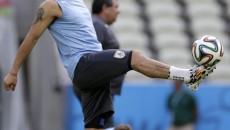 Суарез на вчерашниот тренинг Фото: ЕПА Напаѓачот на Уругвај Луис Суарез со голема веројатност ќе го пропушти...
