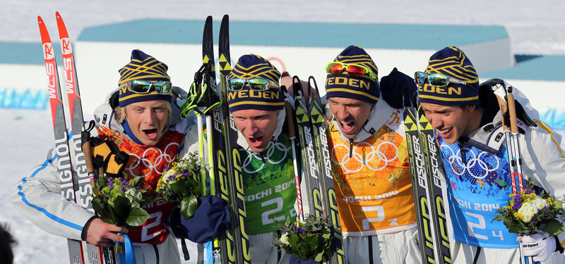 Шведската нордиска скијачка репрезентација го осови златниот медал на штафетната трка во 4×10 километри во нордиско...