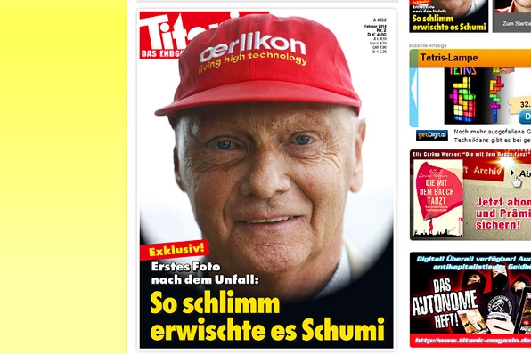 Германскиот сатиричен неделник „Титаник“, во најновиот број се потсмева на несреќата на Михаел Шумахер. „Ексклузивно!...