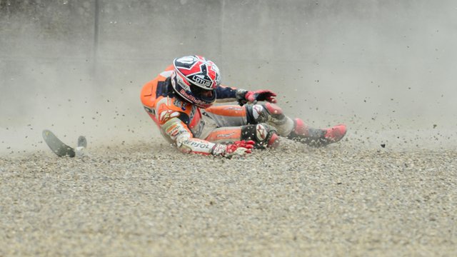 Шпанецот Марк Маркез на Хонда на патеката во Силверстоун доживеа тежок пад. На истото тоа место неколку секунди...