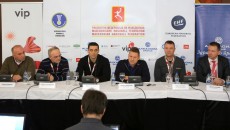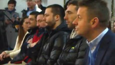 Претседателот на Ракометната федерација на Македонија, Живко Мукаетов, заедно со ракометарите Филип Миркуловски,...
