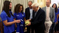 Грчкиот претседател ги одликува младинските ракометарки за напуштањето на натпреварот со „Скопје“ за бранење...