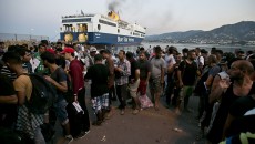 Околу 10.000 бегалци и емигранти се преместени од пристаништето во Митилена на отворен простор во близина на плажата...
