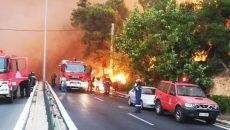 Од 6.40 часот утрово по локално време, грчката противпожарна служба, со девет пожарникари, три возила и еден хеликоптер...