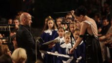 Воодушевена публика и овации добија македонските уметници што настапија во предворјето на црквата „Света Софија“...
