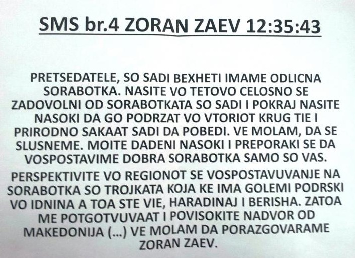 Вистинската конверзација почнува да се одвива од четвртата смс порака која Зоран Заев му ја праќа на Мендух Тачи...