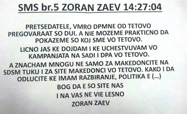 Во последната, петта СМС порака која Зоран Заев му ја испратил на Мендух Тачи тој му признава дека освен што нему...